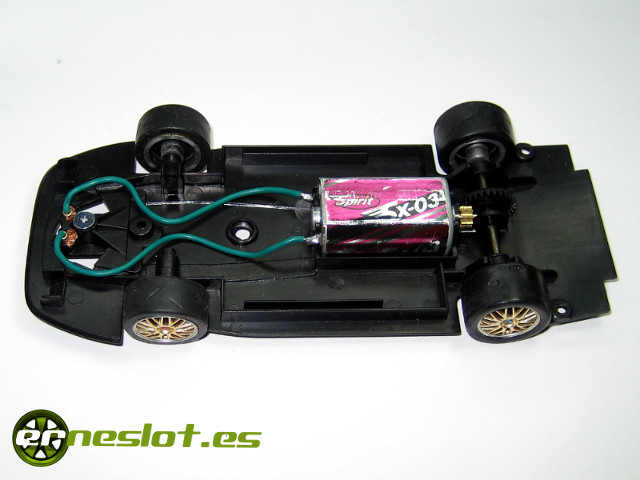 It lacked a rear-view mirror and the rear part that simulates the engine but was in good condition, with its simple Lexan interior. Before I put on the body, I mounted the mechanics of the car in a chassis that I had stored. New front and rear Fly axes in their bags, a Sloting Plus guide and a Spirit SX-03 motor with Avant Slot cables were the mechanics of the car. The chosen pinion/crown ratio was the usual 9/27.