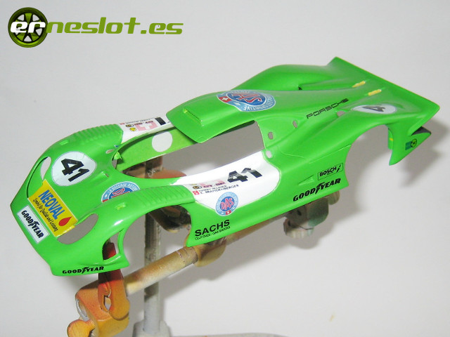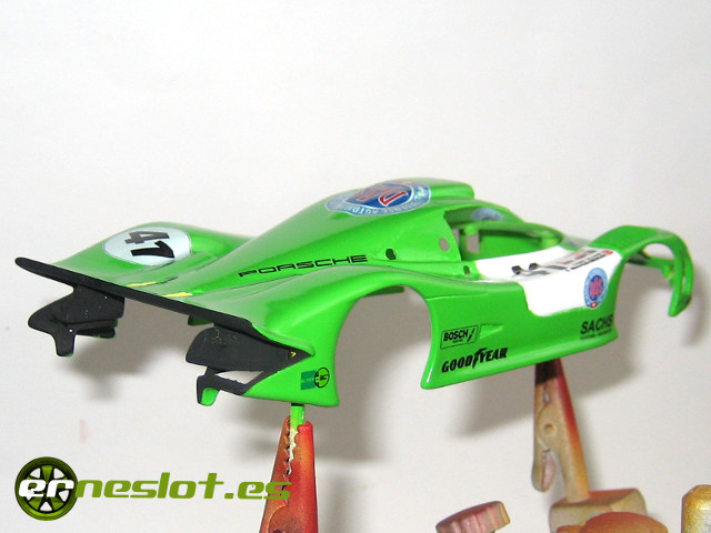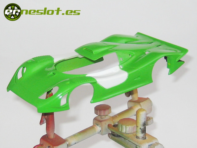 For the livery I chose the same one that I had done to the Porsche 991 of Scaleauto, that you can see in the following link. But unlike with 991, I first painted with bright green paint (Tamiya reference X-15) that I left over from work with the 991, and then masked the doors and painted them in white gloss (Tamiya X-2). Really the ideal process would have been to do it the other way around, starting with the lighter color and painting successively with the darker ones, but I took, in part, this type of work as proof of different techniques. With the paint on the body well dried, I painted the back of the car with matte black paint (Tamiya reference XF-1). In all cases, I applied the painting with the airbrush, masking with tape where necessary. As the masking is sometimes not perfect, and this case was no different, I removed the paint that had been cast under the tape by scraping carefully with a toothpick. The painted car looked like this: