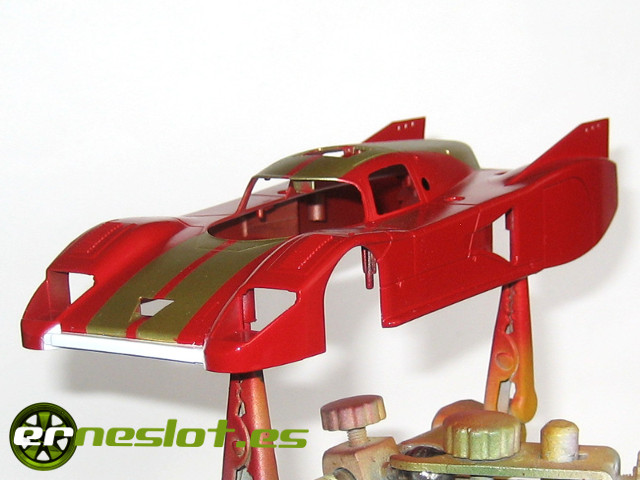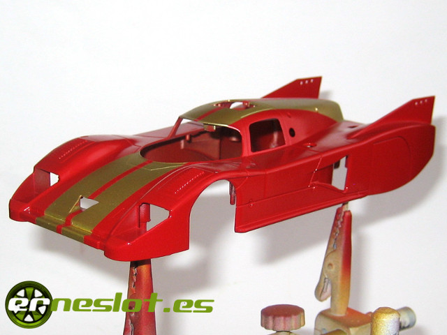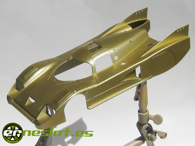 Lógicamente compré uno, porque me parece un coche muy interesante y relativamente desconocido y además, al ser un coche de un constructor británico, tenía clara que decoración iba a tener: la del equipo de Alan Mann. El proceso es un calco del proceso que seguí con el Sauber C9, tras una suave pasada con una fina lija al agua a toda la carrocería, le apliqué una capa de imprimación gris Duplicolor, una vez seca otra suave pasada con la lija pra eliminar imperfecciones y luego la pinté completamente con el color dorado X-12 de Tamiya aplicado con el aerógrafo, con lo que la carrocería quedó así: