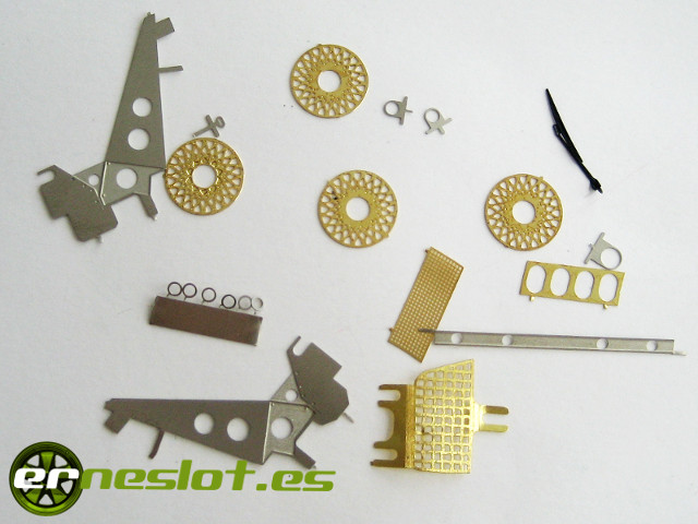 La cantidad de fotograbados que tiene el kit es impresionante, ya que contiene todos los que incluyen los coches estandar. Desde mi punto de vista, no es lo mejor para un coche de slot de competición porque cuantas más piezas formen la carrocería, más probabilidad de que se pierdan en la pista, pero desde el punto de vista de la maqueta, indudablemente la mejoran exponencialmente. En la siguiente imagen podéis ver todos los fotograbados que incluía el kit y que me llevaron un buen rato para colocarlos debídamente en su sitio. Especialmente complicado fue colocar los dos soportes del alerón trasero, pero conseguí dejarlos bien.