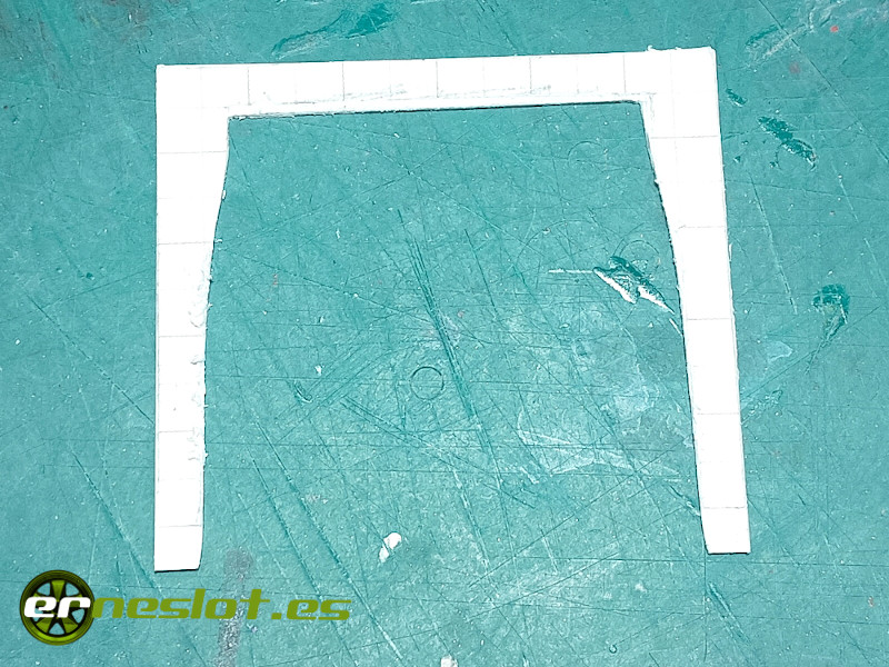 No quería poner un alerón muy grande al coche y sobre todo quería que quedara bien definido. Para ello recorté una pieza de plástico que me serviría de base para dar forma al alerón.