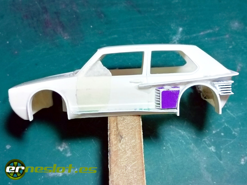 Como se puede ver, modifiqué el frontal del coche para colocar el faldón del Golf Kamei que venía incluido en el kit. No pensaba haberlo colocado, pero el frontal del coche me parecía excesivamente simple y quisé darle un poco más de detalle.