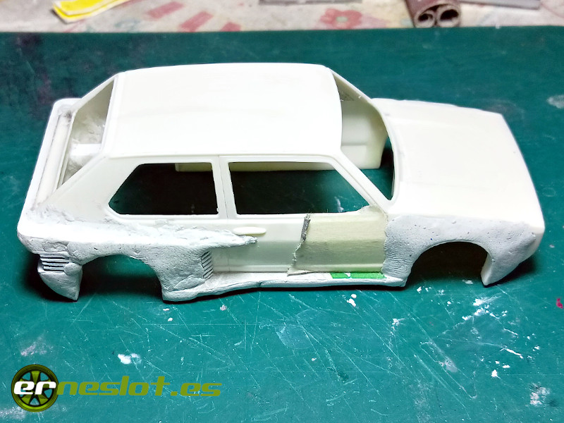 La forma del coche ya iba siendo la que buscaba y llegó el momento de aplicar la masilla bi-componente a toda la carrocería, siempre un poco más de la necesaria para luego definirla completamente lijando y limando suavemente.