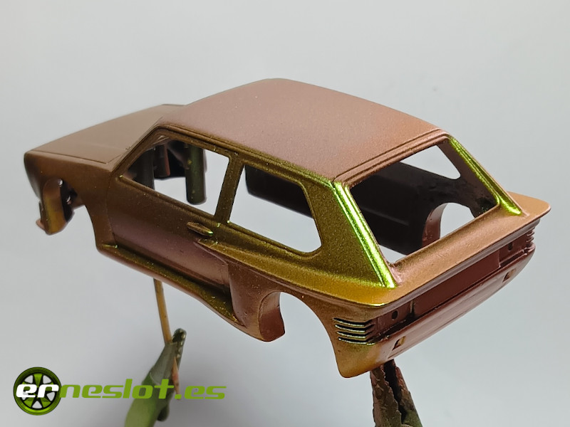 Una vez que la pintura estuvo bien seca coloqué las escasas seis calcas al agua que lleva la decoración (de fabricación propia), y apliqué dos capas de laca de automoción para protergela. Siempre hago lo mismo, una primera capa, que lijo suavemente cuando esta bien seca para eliminar las imperfecciones y una segunda capa para dejar la carrocería perfectamente sellada. La segunda capa no ha quedado perfecta y me ha dejado un poco de efecto de piel de naranja pero es muy sutil.