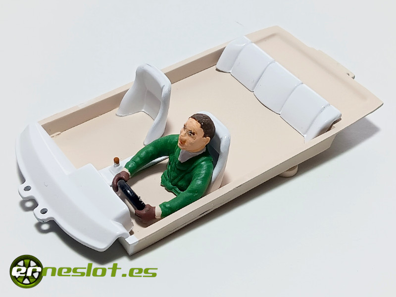 Respecto al interior, quería hacer algo también muy ochentero, asi que sobre una moqueta color crema (esmalte Humbrol 34 blanco mate) tapicé los asientos que incluía el kit ligeramente modificados para encajar en una bandeja menos profunda que la original y el salpicadero de cuero blanco (Vallejo Model Color blanco brillo 70.951). El conductor es un piloto de los que incluía el kit con una cabeza de resina, para simular un conductor de calle (efectivamente, pintar cabezas no es mi fuerte).