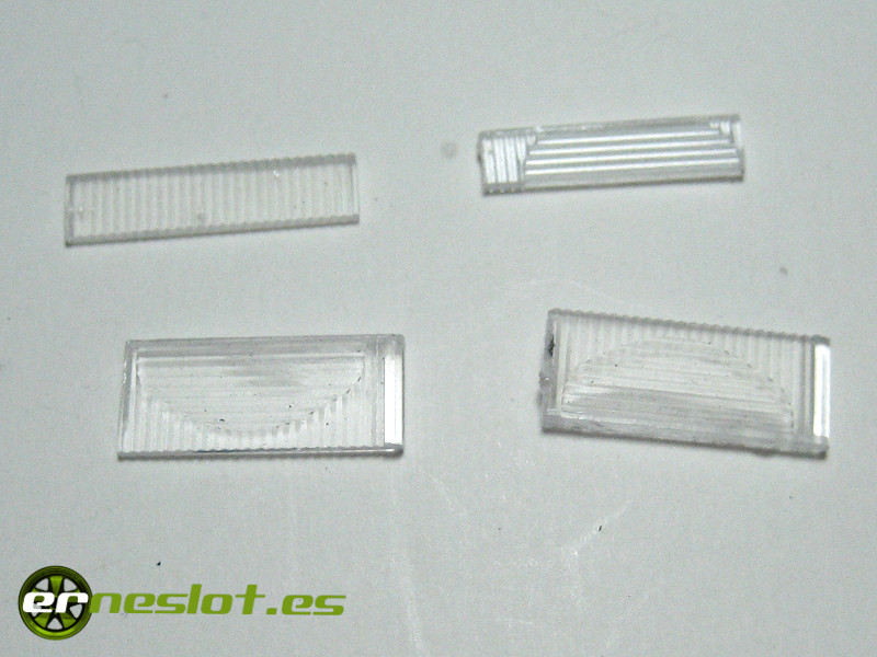 La función de esas varillas eran dejar la rejilla en su posición para que al cortar los faros redondos no variara. Luego corté los faros redondos de la rejilla y pegué en la carrocería unas tiras de plástico para definir la nueva forma de los faros.