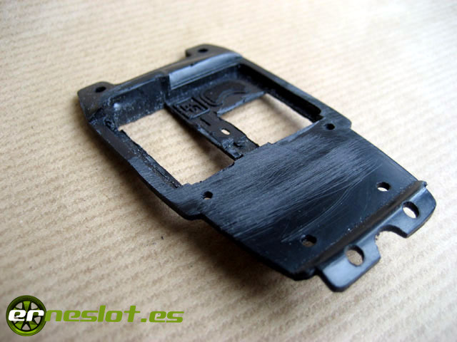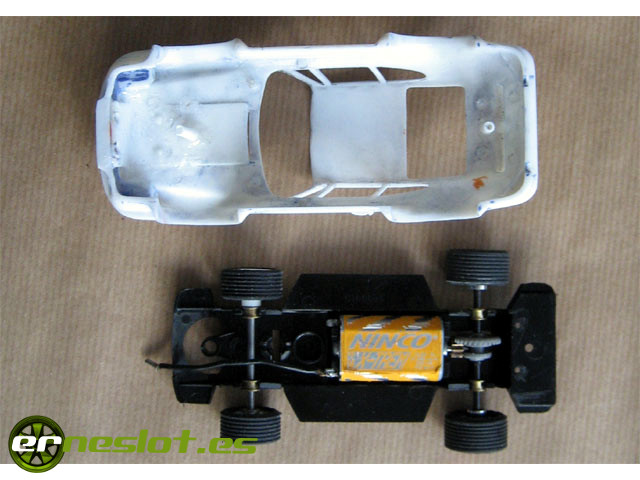 El siguiente paso fue adaptar el chasis. De nuevo utilicé una solución conocida y efectiva, adaptar el chasis del 911 de Ninco. A la carrocería le pego dos tetones con pegamento bicomponente y al chasis lo recorto donde corresponda para que ajuste correctamente: