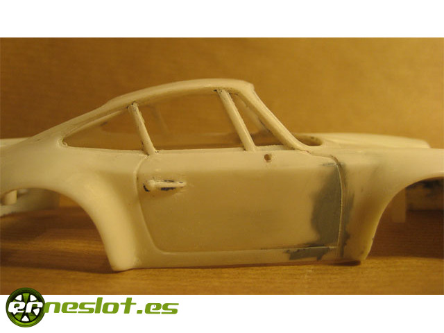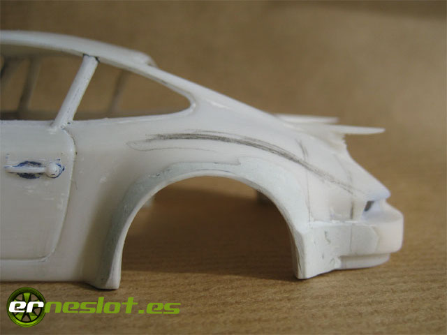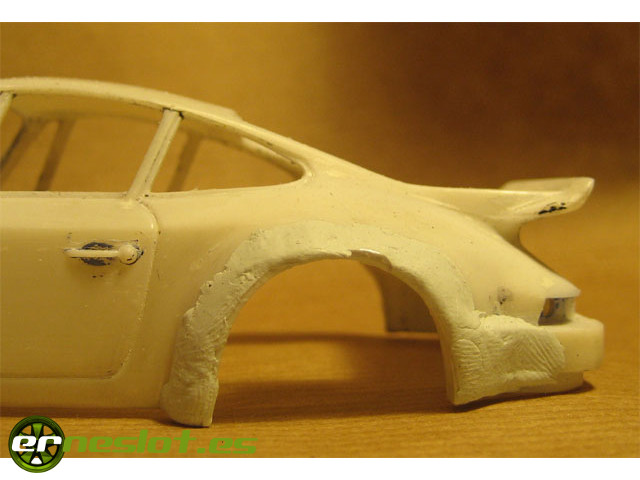 El siguiente paso fue acabar de moldear el paragolpes delantero y ensanchar el paso de rueda trasero, que es un poco estrecho. Lo ensanché 1 milímetro a cada lado ya que comparado con el 911 de Fly Car Model es un poco estrecho y de paso aproveché para darles un poco de forma, para ello les pegué por dentro una tira de plástico evergreen de 0,5 mm de grosor que sobresalía 1 mm. y el hueco que quedaba lo rellené con masilla: