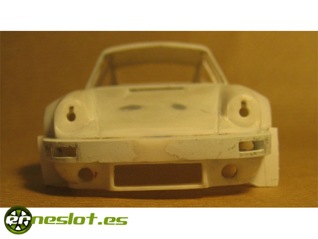 El siguiente paso fue modificar el paragolpes delantero. Uno de los fallos del molde del 911 es que tiene un paragolpes delantero excesivamente largo y con una forma muy cuadrada en comparación con el modelo original, a parte de unos intermitentes exageradamente grandes... De modo que lo acorté alrededor de un milímetro y le di una forma algo más redondeada. En la siguiente foto se aprecia las modificaciones al compararlo con una carrocería sin modificar: