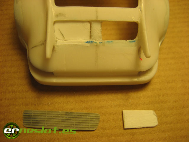 El resultado tras colocar la rejilla no me convenció, ya que quedaba demasiado hundida respecto a la carrocería. Tras darle vueltas al asunto y ver fotos y más fotos del coche me di cuenta de un detalle, bueno, más bien de dos detalles. El que fundamentalmente afecta a la rejilla es que el capó trasero está ligeramente abombado en el lugar de la rejilla, de modo que la inclinación es menor que la que había dejado. Esto lo solucioné a base de masilla y plástico evergreen.