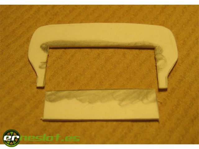 Por último modifiqué la forma del paso de rueda delantero en su unión con el paragolpes, ya que en el modelo original tiene más curvatura hacia delante que en el modelo de Altaya, que cae recto, para ello usé dos piezas de evergreen de 1mm a las que di la siguiente forma: