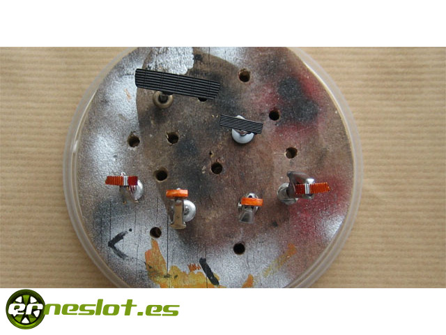 Los neumáticos traseros son de Ninco y los delanteros de Scalextric torneados para reducir su diámetro. El motor es un Ninco NC3 con piñón de 9 dientes y corona Cartrix de 31 dientes.