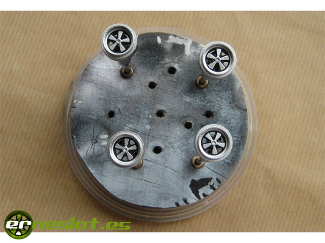 Para las llantas del coche utilicé las Fuchs de Ninco, con los radios pintados con la misma pintura metalizada que los faros.